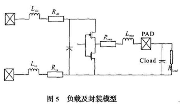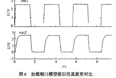 由于ESD 保護(hù)電路以及封裝所帶來的寄生電容和寄生電感對原有輸出信號會有影響,尤其是在高速模擬電路中,頻率越高信號畸變越嚴(yán)重,所以建立合適的仿真模型并進(jìn)行有效的仿真是必須的。信號一般經(jīng)過驅(qū)動, ESD 保護(hù),和封裝引線才能傳到芯片外的負(fù)載上,封裝的模型根據(jù)選用的封裝形式和廠家提供的參數(shù)決定。 一般IC 封裝會給出端口的寄生電容,電阻和電感,其等效模型如圖5所示。 將該模型與前面的ESD 保護(hù)電路(圖3) 串連起來就可以得到端口模型, 可用spice 對用于USB2.0 的環(huán)境,在480 MHz 頻率下的收發(fā)電路進(jìn)行仿真,其仿真波形如圖6 所示。 輸出端口out1 是不考慮端口模型的影響,480 MHz 時鐘的輸出較為理想,out2 是加入端口模型后的時鐘輸出,波形有所畸變,但仍能滿足電路設(shè)計要求。