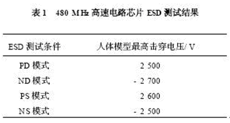 上述ESD 保護(hù)電路(見圖3) 在被應(yīng)用于設(shè)計USB2. 0 接口芯片中。 該芯片的最高時鐘頻率為480 MHz ,采用TSMC 公司的0. 25μm 混合信號工藝進(jìn)行了流片。 流片后的芯片用抗靜電測試儀( Thermo Keytek 公司,型號: ZAPMASTER 714)進(jìn)行了測試,其結(jié)果如表1 所示,給出了在上述4 種不同的放電模式下的耐壓值。 測試結(jié)果表明在所有測試條件下的人體模型最高擊穿電壓(V) 超過了正負(fù)2 500 V。
