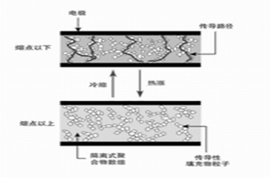 PPTC電路保護(hù)組件是以特殊塑料及傳導(dǎo)性粒子混合而成的傳導(dǎo)式聚合物,如圖1所示。在常溫下,該傳導(dǎo)性粒子會(huì)在聚合物中形成低阻值鏈路,當(dāng)溫度上升超過該組件的切換溫度時(shí),聚合物中的微晶粒就會(huì)熔化,變成非結(jié)晶狀。當(dāng)微晶粒階段熔化期間數(shù)量增加時(shí),會(huì)使傳導(dǎo)性粒子分離,導(dǎo)致該組件內(nèi)阻抗呈非線性增加。產(chǎn)生熱的原因是由于周圍環(huán)境或電池溫度上升所致,也可能受到過電流狀態(tài)下阻抗加熱引起,或是因前述不當(dāng)?shù)某潆姰a(chǎn)生。