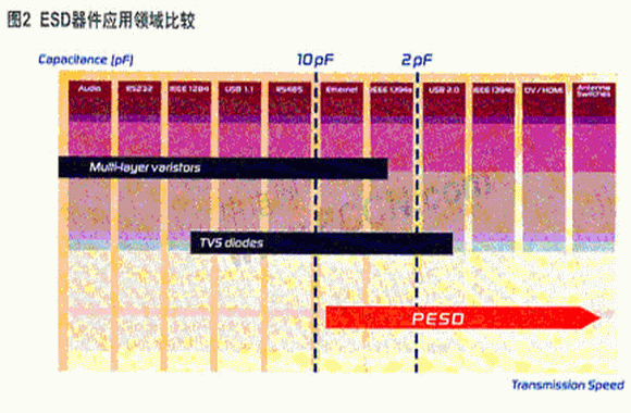 低電容ESD保護對于高速條件下保持數(shù)據(jù)的完整性是非常關鍵的。在常見的瞬間過電壓抑制器件中,金屬氧化物壓敏電阻(MOV)和多層壓敏電阻(MLV)因價廉物美而應用廣泛。但其固有的高電容決定了其應用范圍只能局限于低頻領域和電源的瞬間電壓抑制上。而硅類ESD防護器件,包括齊納二極管、TVS二極管/陣列等,雖然具有保護電壓低而準確的優(yōu)點,其寄生電容依舊不可忽視,通常難以適用于高速數(shù)據(jù)通訊接口,如HDMI、IEEE1394等。