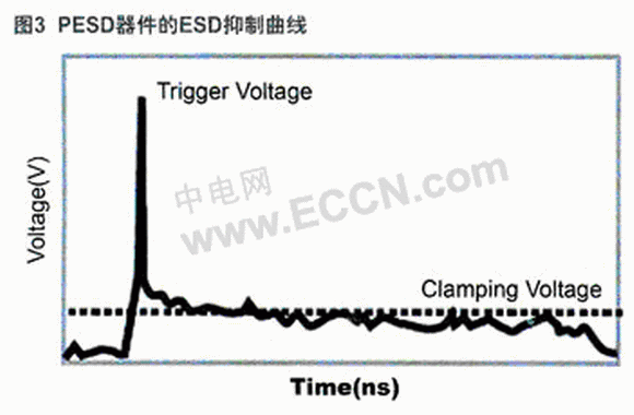 為滿足高速數(shù)據(jù)通訊接口既ESD保護有效、又不影響高速信號傳輸?shù)囊?。近年來,市場上推出了多種專門適用于此類保護要求的器件。其中以瑞侃電路保護部門(RCP:RaychemCircuit Protection)推出的PESD器件為代表。該器件的電容極低(通常0.25pF),漏電流極小(<0.001 A);ESD防護快速有效(響應曲線如圖3所示,觸發(fā)電壓典型值為150~250V;響應時間少于1 ns);價格低于低電容硅器件。因此,在高速數(shù)據(jù)傳輸條件下,PESD器件擁有更佳的保護應用特性。該器件已成功應用于HDMI1.3和USB2.0等多種高速接口電路。