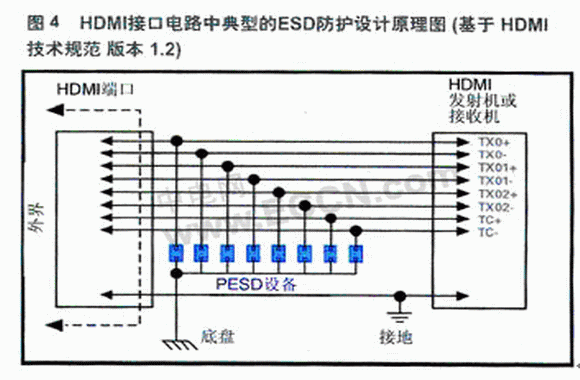 圖4、圖5和圖6展示了利用瑞侃電路保護部門PESD器件對HDMI1.3、USB2.0和IEEE1394接口電路進行保護的典型應用。這些保護將ESD與敏感電路隔離。在傳輸線路脈沖(TLP) 測試和IEC61000-4-2測試中,尤其是經(jīng)過多次采樣(1000次TLP測試)后,其性能要比其他可比較的元件好。相對于其他典型的聚合物ESD防護器件,這類PESD器件的較低觸發(fā)電壓(通常150V)和低箝位電壓(通常25V)能更好的幫助保護敏感電子元件。該器件采用電子工業(yè)中最流行的0603和0402貼裝形式,符合RoHS的嚴格要求;幫助機頂盒敏感電路、手提電腦、手機和其它便攜式設備免ESD侵害。