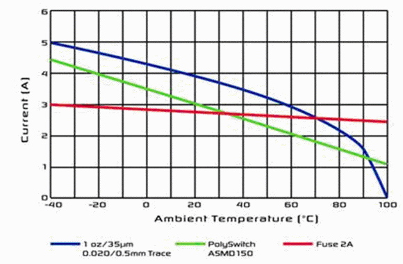 必須注意的是,在整個溫度范圍內(nèi),PPTC器件的觸發(fā)電流是如何跟隨印制線上的電流。在這兩種情況中,即使可以使用熔斷器,在汽車高于有用的標(biāo)準(zhǔn)溫度下,尺寸最接近的熔斷器也不能保護(hù)它。