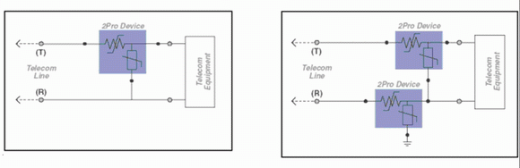 2Pro器件符合RoHS標(biāo)準(zhǔn),它把PolySwitch PPTC過流保護(hù)技術(shù)和金屬氧化物壓敏變阻器(MOV)集成在一起,構(gòu)成一個(gè)過熱保護(hù)器件,在出現(xiàn)過流現(xiàn)象時(shí)抑制電流,在發(fā)生過壓現(xiàn)象時(shí)對(duì)電壓進(jìn)行箝位。這種單器件做法,有助于減少元件數(shù)量、提高設(shè)備的可靠性。圖1說明了在不接地和接地兩種電路保護(hù)方案中如何使用2Pro器件。