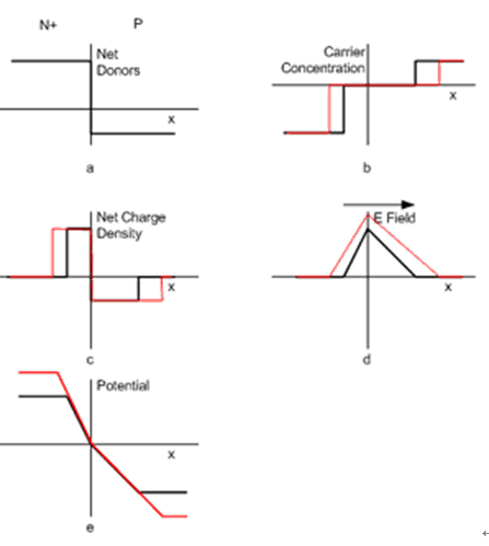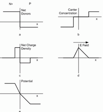 二極管的特性可以通過如圖1所示的突變型PN結(jié)來做深入理解??紤]到兩片硅材料,一片是重?fù)搅耸┲麟s質(zhì)的n+硅,一片是輕摻了受主雜質(zhì)的p硅。如圖1a所示那樣我們在x=0處將它們結(jié)合。n+區(qū)域電子密度等于施主雜質(zhì)的數(shù)目,而P區(qū)域認(rèn)為空穴密度等于受主雜質(zhì)濃度,但這種靜態(tài)情況將不會持續(xù)。在PN結(jié)邊界處電子將和空穴重新結(jié)合,結(jié)果是導(dǎo)致在PN結(jié)連接處的區(qū)域電子和空隙全被耗空。這就是圖1b所示的耗盡層,或者說是零載流子濃度區(qū)域。在這個連接處區(qū)域隨著載流子濃度的耗盡就成為靜電荷區(qū)域,如圖1c。在橫坐標(biāo)零點(diǎn)左邊,由于電子和右邊的空穴中和從而只剩下帶正電的靜電荷;在零點(diǎn)右邊,由于空穴和左邊的電子中和從而只剩下帶負(fù)電的靜電荷。在PN結(jié)連接處的兩邊耗盡區(qū)的寬度依賴于兩邊施主雜質(zhì)和受主雜質(zhì)各自的摻雜濃度。有個物理現(xiàn)象是PN結(jié)耗盡區(qū)總的正電荷數(shù)和負(fù)電荷數(shù)一樣,所以PN總體還是呈現(xiàn)不帶電狀態(tài)。 PN結(jié)連接處摻雜濃度高的一邊的耗盡層寬度比摻雜濃度低的一邊要窄得多。 耗盡區(qū)一定的靜電荷密度的存在產(chǎn)生了一個電場,其場強(qiáng)最大的地方是PN結(jié)連接處,如圖1d所示。PN結(jié)的電場存在產(chǎn)生了內(nèi)建電壓差,如圖1e所示。電場和電壓的存在會迫使電子向n區(qū)域移動,而空穴向p區(qū)移動。