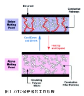 保護繼電器的一個常用元件是高分子聚合物正溫度系數(shù)(PPTC)自復過流保護器(見圖1)。 它是用碳黑這種導電性填料做成的。在這個元件中碳黑構成網(wǎng)狀導電通路。在正常的情況下,PPTC保護器呈現(xiàn)低電阻,但是,在PPTC保護器中流過的電流過大時,它的溫度升高,結晶狀聚合物變成非結晶狀態(tài)。這個轉變引起聚合物膨脹,使得導電性聚合物內的網(wǎng)狀導電通路斷開。這個變化引起它的電阻急劇上升。由于電阻增大,于是保護器中流過的電流便下降到很小。PPTC保護器保持這個狀態(tài),直到故障被排除。一旦把故障排除了,保護器的溫度下降,碳黑形成的導電通路恢復,它又回到低電阻狀態(tài)??梢圆皇褂肞PTC 保護器而用傳統(tǒng)的熔斷器來保護繼電器。不過,在使用熔斷器的情況下,每當發(fā)生故障,就需要更換熔斷器。PPTC保護器的主要優(yōu)點在于它具有自復功能,從而可以減少昂貴的服務費用和保修費用。