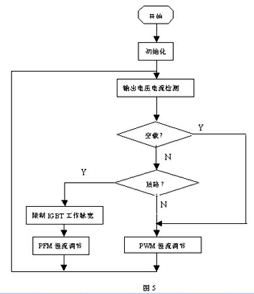 同時(shí)為保證輸出電流恒定,單片機(jī)在判斷輸出為短路時(shí)將逆變器的等脈沖寬度調(diào)節(jié)(PWM)變?yōu)轭l率調(diào)節(jié)控制(PFM),即脈沖分頻控制,輸出電壓越低,輸出脈沖的頻率越低。其單片機(jī)程序過程如圖5所示: