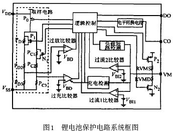 圖1 給出了鋰電池保護(hù)電路的系統(tǒng)框圖。圖中,VDD 和VSS 分別是電池電源和地輸入端; CO 和DO 分別是充電及放電控制端, 在正常工作模式下均為高電平, 電池既可以充電又可以放電, 反之, 充電和放電回路被切斷;VM 是放電過流、充電過流檢測(cè)端。電路實(shí)現(xiàn)的功能如下: