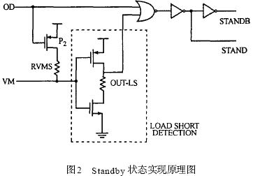 圖中信號(hào)OD 由數(shù)字電路產(chǎn)生, 當(dāng)比較器檢測(cè)到電池電壓低于過放電檢測(cè)電壓, 并經(jīng)過延時(shí)后,OD 將從高電平變?yōu)榈碗娖? 此時(shí)通過P2 管將VM拉到高電平, 再經(jīng)反相后從負(fù)載短路輸出OUT_L S端輸出低電平, 使輸出端STAND 變?yōu)榈碗娖?STANDB 為高電平, 意味著系統(tǒng)可以進(jìn)入Standby狀態(tài); 一旦電池充電開始時(shí),VM 端迅速被置為低電平, 此時(shí)不管OD 如何, 都通過OUT _LS 將STAND恢復(fù)為高電平, 系統(tǒng)進(jìn)入正常的檢測(cè)狀態(tài)。