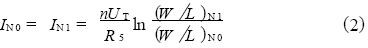 由圖3 可見, P0 和P1 組成電流鏡, 取相同的寬長比, 則。在P1、P0、N0、N1 和R5 構(gòu)成的自偏置電路中, 選擇合適的R5 值, 可以使N0 和N1工作在亞閾值區(qū)。并且, 在時(shí), 亞閾值MOS 管的漏電流Id 可表示為: