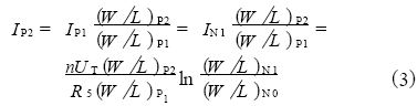 式(2) 中可以看出, 不考慮電阻R1的溫度系數(shù),電流IN 1與熱電壓U T 成線性關(guān)系, 具有正溫度系數(shù)。P2 和P1組成電流鏡, 假定流過P2 的電流為IP2, 則有: