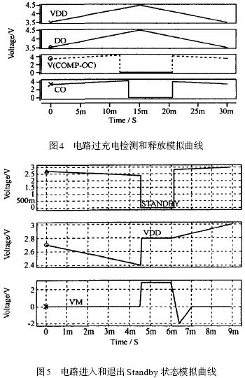 電路采用UMC 0. 6 μm 數(shù)字電路SPICE 模型進(jìn)行HSPICE 模擬驗(yàn)證。圖4 給出了電路對(duì)電池電壓VDD 進(jìn)入和退出過充電狀態(tài)時(shí)的模擬結(jié)果, 從圖中可看出, 過充電出現(xiàn)后, CO 端被置為低電平, 反之則是與電源電壓相等的高電平。