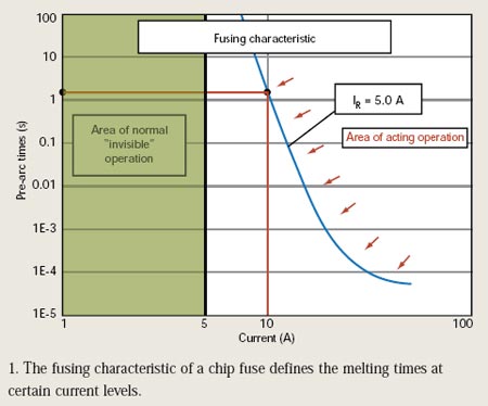 熔斷特性是芯片保險(xiǎn)絲最重要的屬性(圖1)。該特性界定了在一定電過(guò)流條件下的熔斷時(shí)間。若電流達(dá)到一定預(yù)設(shè)值,則在稱為弧前(pre-arc)時(shí)間的一個(gè)已知期限內(nèi),熔斷元件內(nèi)耗散的電能足以把其熔化并汽化。