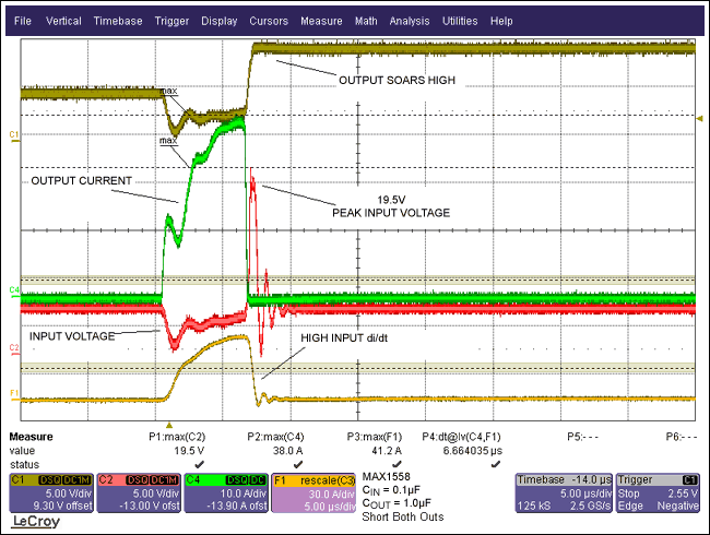 雖然器件在這硬件短路時幸免于難,但仍推薦選用一個更大的輸入旁路電容,以限制最大電壓,使其低于數(shù)據(jù)資料中規(guī)定的極限參數(shù)。