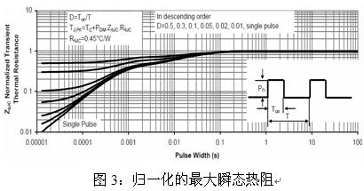 由圖3最下面一條曲線(單脈沖)可知,對(duì)于單脈沖來(lái)說(shuō),要想獲得0.015的熱阻系數(shù),其脈沖寬度不能大于20us。