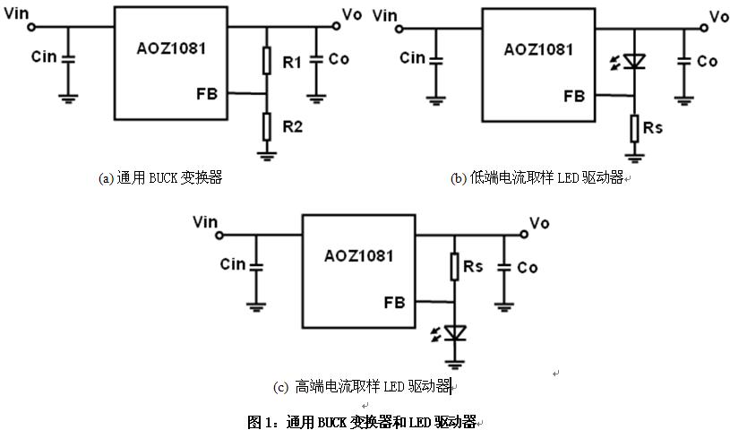 本文將基于AOZ1081來介紹反饋環(huán)的設(shè)計(jì),因此先介紹一下AOZ1081的工作特點(diǎn)。AOZ1081是一款降壓型Buck變換器,工作于電流模式,其特點(diǎn)可以讓它配置成LED驅(qū)動器,同時(shí)也可以作為通用Buck變換器使用。其特點(diǎn)如下: