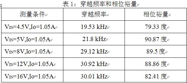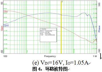 基于AOZ1081設(shè)計(jì)LED驅(qū)動器,輸入電壓4.5 V到16 V,輸出為一個(gè)HB LED,;使用Venable的3120測量環(huán)路,Rc=61.9kohm,Cc=820pF,測量波形和結(jié)果如圖4和表1所示。