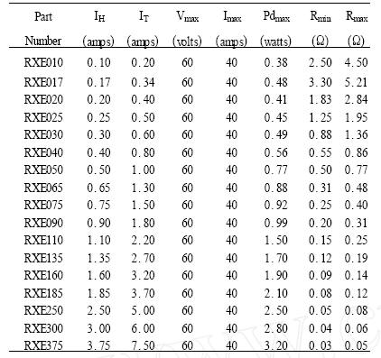 PolySwitch元件有多種系列產(chǎn)品,其產(chǎn)品特性各不相同。以常用的RXE系列元件為例,其20℃時的電氣特性如表1所示。