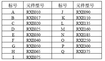 RXE系列PolySwitch元件20℃時的動作保護(hù)特性曲線見圖1。其中橫坐標(biāo)表示故障電流,單位為安培,縱坐標(biāo)表示動作時間,單位為秒。兩個坐標(biāo)軸均為對數(shù)坐標(biāo)。圖中每一條曲線對應(yīng)一個型號的元件,構(gòu)成該系列元件的動作保護(hù)特性曲線簇。表2為圖1中曲線標(biāo)號與元件型號的對照表。