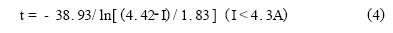 由表1可知,RXE系列PolySwitch元件所能承受的最大電流為40A。該點與臨界點之間為曲線的直線部分。設(shè)動作時間為t(秒),故障電流為I(安),考慮到橫軸、縱軸均為對數(shù)坐標(biāo),兩者之間應(yīng)具有如下數(shù)學(xué)關(guān)系: