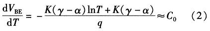 如果忽略由溫度變化引起lnT項(xiàng)變化對(duì)式(2)的影響,dVBE/dT可近似等于常數(shù)C0。常溫下C0約為-2 mV/K。為了簡(jiǎn)化計(jì)算,則PN結(jié)關(guān)于溫度的變化方程可近似線(xiàn)性為