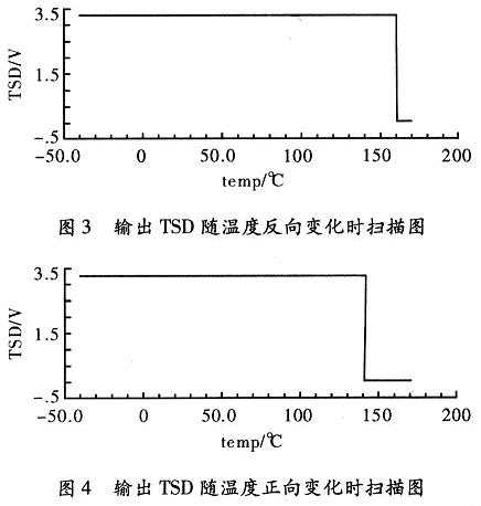 按照以上設(shè)計(jì)的電路。用Cadence Specture對(duì)其進(jìn)行仿真,器件的模型參數(shù)采用0.35μm CMOS工藝。圖2為過(guò)溫保護(hù)電路的輸出控制信號(hào)TSD,隨溫度上升和下降的曲線(xiàn)。電源電壓取3.3 V。從仿真結(jié)果可以看出,該電路實(shí)現(xiàn)了良好的“溫度遲滯”特性。遲滯功能有效的避免了芯片出現(xiàn)熱振蕩問(wèn)題。關(guān)斷溫度TH160°和恢復(fù)溫度TL140°。