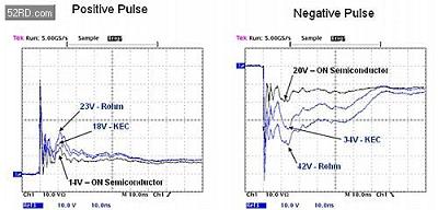從圖3所示的圖上可見,顯然,與兩個競爭對手的器件(藍色波形)相比較,安森美半導(dǎo)體保護解決方案(黑色波形)可提供更低的ESD脈沖箝位電壓。與KEC的18V和Rohm的23V相比較,安森美的器件將正脈沖箝位在14V。而在負脈沖期間,這三個器件之間箝位電壓的差異更加明顯。安森美、競爭對手2和競爭對手1的器件對負脈沖的箝位電壓分別是20V、34V和42V。