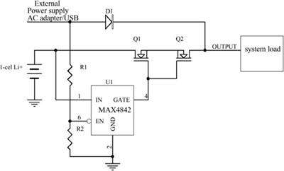 另外,MAX4842的過壓保護門限為4.4V-5.0V,也高于單節(jié)鋰電的4.2V上限電壓。電源切換電路是利用MAX4842的使能控制引腳/EN配合分壓電阻R1/R2實現(xiàn)的。當沒有外部電源接入時,如果電池電壓高于2.8V-3.2V的保護門限,/EN被R2拉低,MAX4842驅(qū)動Q1、Q2的柵極為高電平使其導通,電池為負載供電;當有外部電源接入時,通過R1/R2分壓后在/EN引腳上產(chǎn)生的電壓高于1.47V后MAX4842被禁止,Q1、Q2被關閉,由外部電源給負載供電。圖中的二極管D2用于阻斷灌入外部電源的反向電流,并防止/EN被錯誤拉高。由于它串在外部供電通路上,損失一點效率沒有關系。