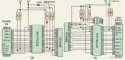 上面兩個(gè)圖分別給出了HDMI源設(shè)備的高集成度解決方案和HDMI終端設(shè)備的高集成度解決方案的電路示意圖。