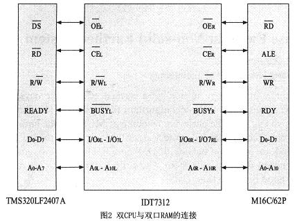由于系統(tǒng)采用雙CPU,為了實(shí)現(xiàn)兩個(gè)CPU之間大量數(shù)據(jù)的快速交換,本裝置采用雙口RAM來實(shí)現(xiàn)兩CPU之間快速的數(shù)據(jù)交換。