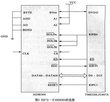 TMS320LF4207A本身雖然自帶A/D轉(zhuǎn)換器,但其轉(zhuǎn)換精度只有10位,且轉(zhuǎn)換速度也不高(500ns)。為了實(shí)現(xiàn)更高的速度和精度,選擇了擴(kuò)展ADS8364芯片。ADS8364是一種高速、低功耗、雙16bA/D轉(zhuǎn)換器,有6個(gè)模擬量輸入通道??捎肂VDD獨(dú)立供電。它有6個(gè)完全相同的采樣保持電路,分成A、B、C3組,每一組都由1個(gè)HOLD引腳控制。ADS8364可以從外部引入最大5MHz的時(shí)鐘頻率,此時(shí)采樣時(shí)間是0.8μs,轉(zhuǎn)換時(shí)間只有3.2μs,A/D的最大采樣率達(dá)到250K,要達(dá)到此值,可在下一次轉(zhuǎn)換開始時(shí)讀取上一次的轉(zhuǎn)換結(jié)果。此A/D完全可以滿足本裝置的采樣要求。AD芯片與DSP的連接如圖3所示。