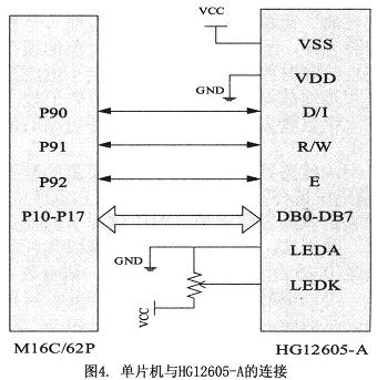 HG12605-A中內(nèi)藏ST7920點(diǎn)陣式LCD控制與驅(qū)動芯片,可以顯示字母、數(shù)字符號、漢字、以及自定義文字符號。ST7920芯片內(nèi)部集RAM和ROM、字型產(chǎn)生器、以及液晶驅(qū)動器和控制電路于一體,因此,只要一個(gè)很小的處理系統(tǒng),就可以操作HG12605-A液晶顯示模塊,并且硬件連接簡單。液晶模塊和單片機(jī)的連接如圖4所示。