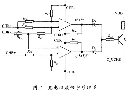為了確保充電時(shí)的安全性和延長電池的使用壽命,電池的充電溫度應(yīng)控制在O~45℃之間為宜。該系統(tǒng)采用一個(gè)負(fù)溫度系數(shù)的NTC溫度傳感器RES和一個(gè)2路比較器LM393來實(shí)現(xiàn)充電溫度保護(hù),其原理圖如圖2所示:當(dāng)充電溫度位于O~45℃之間時(shí),LM393的兩路比較器輸出均為高阻態(tài),PNP型三極管Q1關(guān)斷,對(duì)充電電路不產(chǎn)生影響;隨著溫度的升高,RES阻值逐漸變小,當(dāng)溫度大于45℃時(shí),LM393下面一路比較器反轉(zhuǎn),輸出低電平,通過二極管D6將Q1的B極拉低,Q1導(dǎo)通,充電MOS管QCHRl的G極C_QCHR被強(qiáng)制拉高,QCHRl關(guān)閉,停止充電;同樣,隨著溫度的降低,RES阻值逐漸變大,當(dāng)溫度小于O℃時(shí),LM393上面一路比較器輸出低電平,通過二極管D5將Q1導(dǎo)通,從而關(guān)閉QCHRl,停止充電。[page]