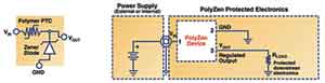 新一代增強聚合物齊納二極管也可以保護敏感的電子器件免于被感應(yīng)電壓尖峰、瞬態(tài)過壓、不正確的供電和極性接反等所損壞。如圖1所示,PolyZen器件包括一個用于電壓鉗位的穩(wěn)壓齊納二極管和一個非線性PPTC薄膜器件。