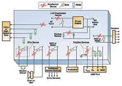 圖2描述了一個典型的用于安防和火警系統(tǒng)的電路保護方案。其中,過流保護是通過PolySwitchPPTC器件實現(xiàn)的。過壓保護是通過金屬氧化物變阻器和PESD器件實現(xiàn)的,并且集成了前面所描述保護設(shè)備I/O端口的PolyZen和2Pro器件。