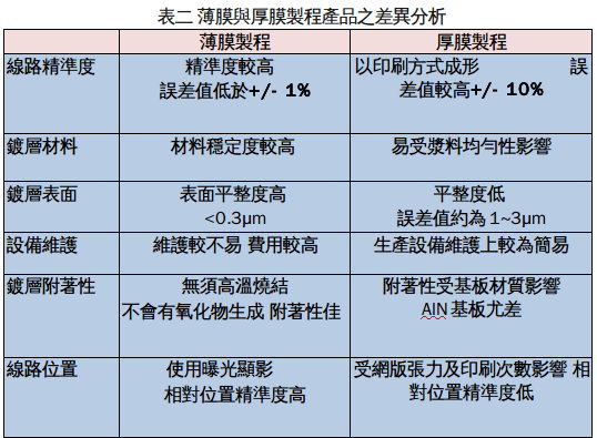 但從產(chǎn)品成本結(jié)構(gòu)來看,如表二所示薄膜產(chǎn)品的工藝設(shè)備(黃光微影)與生產(chǎn)環(huán)境(無塵或潔凈室)相較于厚膜產(chǎn)品其成本較高,然而薄膜工藝的金屬線路多以厚銅材料為主,相較于厚膜印刷之厚銀而言,材料成本卻相對較低,因此,可預(yù)期的當(dāng)利用薄膜工藝將陶瓷基板金屬化的產(chǎn)品,日漸達(dá)到經(jīng)濟(jì)規(guī)模時,其成本將逐漸趨近于厚膜產(chǎn)品。