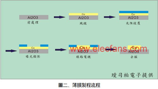 薄膜技術(shù)的導(dǎo)入正可解決上述線路尺寸縮小的工藝瓶頸,結(jié)合高真空鍍膜技術(shù)與黃光微影技術(shù),能將線路圖形尺寸大幅縮小,并且可同時符合精準(zhǔn)的線路對位要求,其各單元的圖形尺寸的低差異性(高均勻性)更是傳統(tǒng)網(wǎng)版印刷所不易達(dá)到的結(jié)果。在高熱導(dǎo)的要求下,目前璦司柏(ICP)的薄膜工藝技術(shù)已能克服現(xiàn)階段厚膜工藝在對位精準(zhǔn)度的瓶頸,圖(二)即為薄膜工藝之簡易流程圖,在空白陶瓷基板上(氧化鋁/氮化鋁)經(jīng)過前處理之后,鍍上種子層(sputtering),經(jīng)過光阻披覆、曝光顯影,再將所需之線路增厚(電鍍/化學(xué)鍍),最后經(jīng)過去膜、蝕刻步驟使線路成形,此工藝所備制之產(chǎn)品具有較高的線路精確度與較佳的金屬鍍層表面平整度。