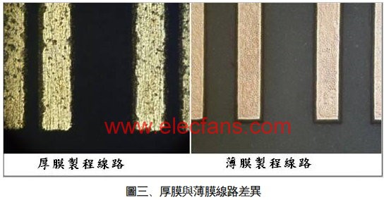 圖(三)即為璦司柏薄膜基板產(chǎn)品與傳統(tǒng)厚膜產(chǎn)品的金屬線路光學(xué)顯微圖像。可明顯看出厚膜印刷之線路,其表面具有明顯的坑洞且線條的平整度不佳,反觀以薄膜工藝制備之金屬線路,不但色澤清晰且線條筆直平整。