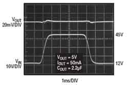 圖3LT3050針對(duì)負(fù)載突降情況的瞬態(tài)響應(yīng)(AC耦合)