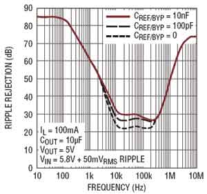 LT3050能有效地將天線電源與12V電源線上的噪聲或者來自某個(gè)中間降壓型穩(wěn)壓器的噪聲隔離開來(見圖4)。單個(gè)電容器提供了基準(zhǔn)軟起動(dòng)和噪聲旁路功能,從而實(shí)現(xiàn)了一個(gè)可編程啟動(dòng)時(shí)間和超低噪聲操作。
