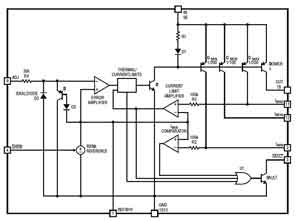 可編程短路檢測(cè)和電流限值在IMAX引腳上提供,而且該限值一旦設(shè)定,則其在整個(gè)電壓和溫度范圍內(nèi)的波動(dòng)幅度將小于5%。IMAX引腳是一個(gè)特別設(shè)計(jì)的電流反射鏡器件的集電極,可提供大約為輸出電流1/200的電流。該引腳同時(shí)也是精準(zhǔn)限流放大器的輸入端。在IMAX和GND之間連接一個(gè)電阻器(RI(MAX)),用于設(shè)定短路檢測(cè)和可編程電流限制門限。限流放大器電路執(zhí)行兩項(xiàng)功能。第一項(xiàng)功能是:如果IMAX引腳電壓達(dá)到600mV,則它將確定集電極開路/FAULT引腳邏輯電平。第二項(xiàng)功能是:它將調(diào)節(jié)輸出驅(qū)動(dòng)電流以使IMAX引腳電壓不超過600mV,從而將輸出電流限制為0.6V•200/RI(MAX)。