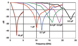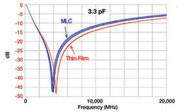 薄膜電容器(如圖1所示)還具有一項前面沒有提及的性能優(yōu)勢:它的響應只有1個諧振點,因為這種器件使用單絕緣層設(shè)計封裝成多層陶瓷電容器(MLCC)。圖2顯示了這種薄膜電容器的部分S21前向傳輸損耗特性曲線。