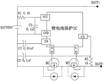 單節(jié)鋰電池保護IC的應用電路很簡單,只需外接2個電阻、2個電容和2個MOSFET,其典型應用電路如圖1所示。