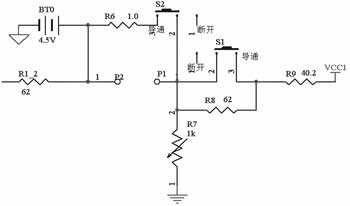 根據(jù)鋰電池保護IC的工作原理設計的測試電路如圖2所示,圖3詳細說明了圖2中模塊B的電路。模塊A在測試過流保護時為CS引腳提供電壓,模擬圖1中的CS引腳所探測到的電壓。調(diào)整模塊中的可變電位器可為CS引腳提供可變電源,控制其中的跳變開關可為CS提供突變電壓。模塊B為電源,模擬為IC提供工作電壓。調(diào)整電路中的可變電位器R7可為整個電路提供一個可變電壓,在測試過充電保護電壓和過放電保護電壓時使用。控制模塊中的開關S1的閉合為測試電路提供一個跳變電源,在測試IC的過充、過放和過流延遲時使用。