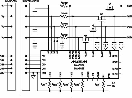Maxim公司推出了一系列電源熱插拔控制器,適應(yīng)于各種背板電源的要求。MAX5927/5929是針對低壓電源系統(tǒng)的+1V到13.2V的四通道熱插拔控制器。在電路板熱插拔時,MAX5927/5929控制輸出電壓緩慢升高,同時限制輸入電流小于預(yù)設(shè)值,避免瞬態(tài)大電流沖擊,保證了系統(tǒng)的安全性和穩(wěn)定性。圖1是典型應(yīng)用電路圖,圖2是熱插拔時的啟動電壓、電流波形??梢钥闯觯琈OSFET的柵極電壓受MAX5927/5929的控制,按照固定斜率上升,逐漸打開MOSFET,輸出到電路板的電壓也基本同步地按斜率上升,瞬態(tài)電流則始終被控制在門限值以內(nèi),避免了大的沖擊電流的出現(xiàn)。啟動時間和電流限值都可以簡單地通過一個外部電阻來設(shè)定,為設(shè)計工程師提供了極大的靈活性。
