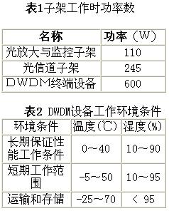 32X2.5GDWDM終端由一個光放大與監(jiān)控子架和兩個光信道子架組成。光放大及監(jiān)控子架和光信道子架采用靠背椅結(jié)構(gòu),子架的光、電信號均采用前出線,高度為11U。3U電源子架提供-48V電源,機架采用21″標準機架。子架工作時的功率參數(shù)和環(huán)境條件見表1與表2。