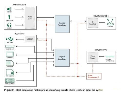 由于手機的設(shè)計對象是大眾消費者,而且可在任何環(huán)境中使用,因此ESD很有可能會進入其中的一個端口或I/O接口,并導(dǎo)致芯片組出現(xiàn)電氣不穩(wěn)定現(xiàn)象或完全損壞。圖2用于幫助說明不同電路該用什么樣的ESD保護技術(shù)。它表明,所有的電路都有可能為ESD進入手機提供一個途徑。