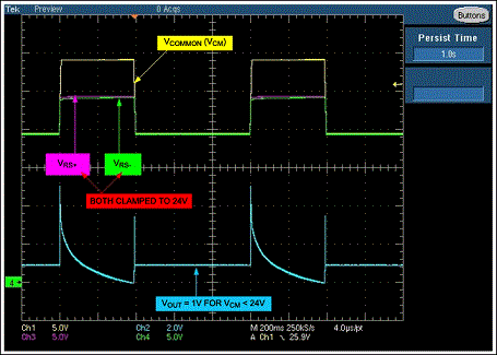 圖2是當(dāng)移走D1時(shí),35V拋負(fù)載脈沖下放大器的輸出。施加電壓為電池標(biāo)稱電壓,所要求的輸出電壓為1V (輸入VSENSE = 50mV、增益 = 20)。出現(xiàn)拋負(fù)載電壓時(shí),齊納管把輸入共模電壓鉗位在大約24V,放大器輸出經(jīng)過幾個(gè)短暫的波動后穩(wěn)定到0V。
