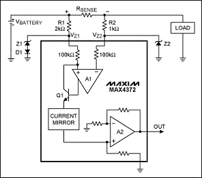 圖1給出了一個(gè)過壓保護(hù)例子,由齊納二極管Z1和Z2、電阻R1和R2以及二極管D1組成。MAX4372放大器的共模電壓范圍為0至28V,足以測量6V至18V范圍的汽車電池電壓。但是,拋負(fù)載電壓可能達(dá)到35V,而且會持續(xù)0.5秒,恰好超過了放大器的30V最大額定輸入電壓,必須通過外部電路保護(hù)放大器。