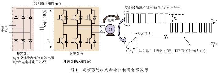 變頻器主要由把交流市電整流成直流的整流器、平滑電壓脈動的電容器、6 個開關(guān)器件構(gòu)成的逆變器所組成。如圖1 所示,逆變器部分輸出由改變脈沖寬度(PWM 波)形成的等效正弦波交流電壓去驅(qū)動電機。近幾年的變頻器為了使電機低噪音化,逆變部分的開關(guān)器件采用IGBT進行著高速開關(guān)動作。因此,在PWM 波的每個脈沖上升和下降時,即開關(guān)時間以非常短的時間駐t=0.1~0.3 滋s切換著的時候,使逆變器內(nèi)部的直流電壓Ed(400 V電力系統(tǒng)用逆變器的Ed=600 V左右)因切換所形成的電壓變化率dv/dt變得很大,這是產(chǎn)生微浪涌的主要根源之一。